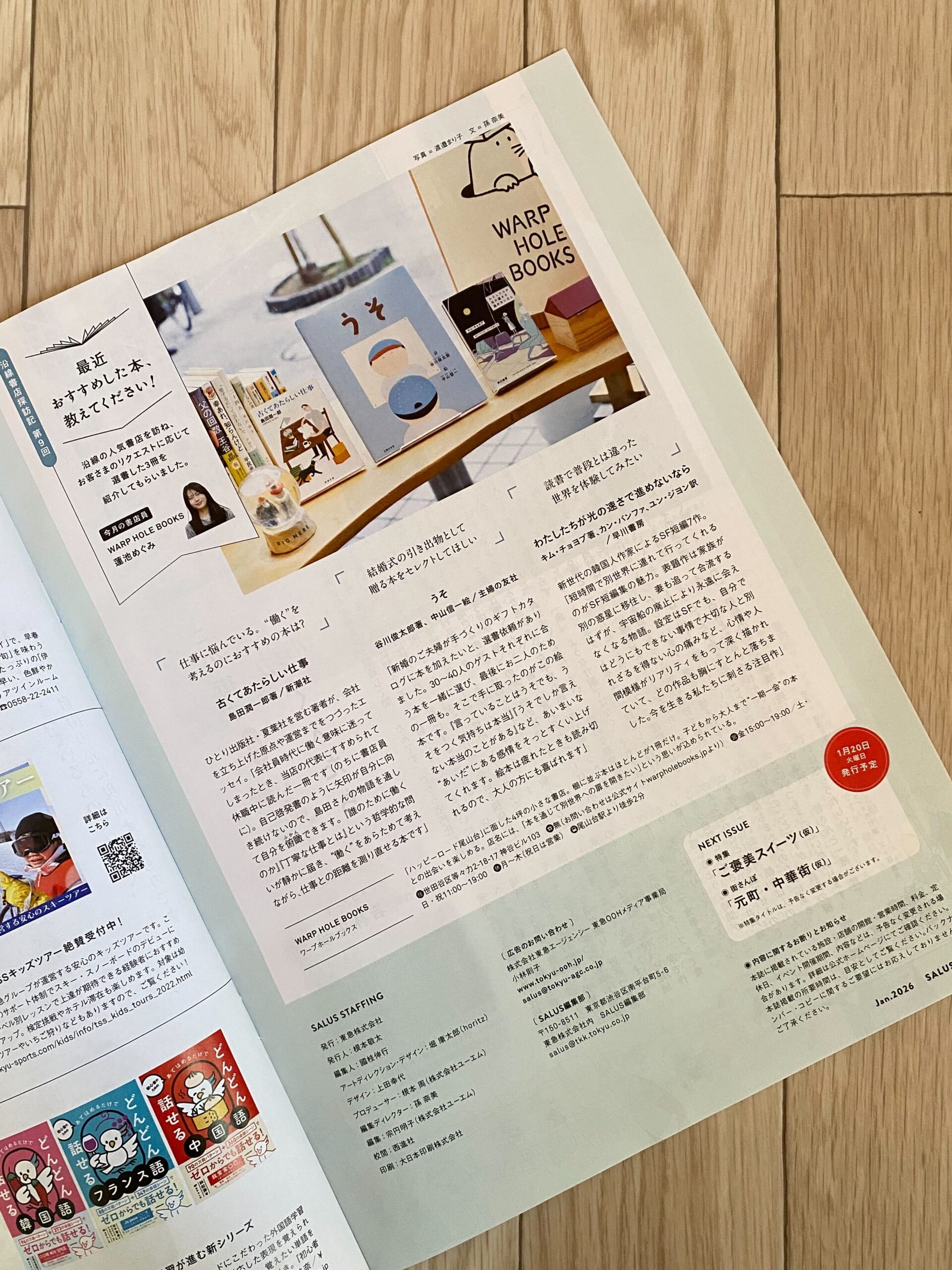 東急線沿線で配布されているフリーマガジン、SALUSの沿線書店探訪記にWARP HOLE BOOKSが登場しています。書店員のめぐみさんが、最近お客さんにおすすめした本を紹介しています。