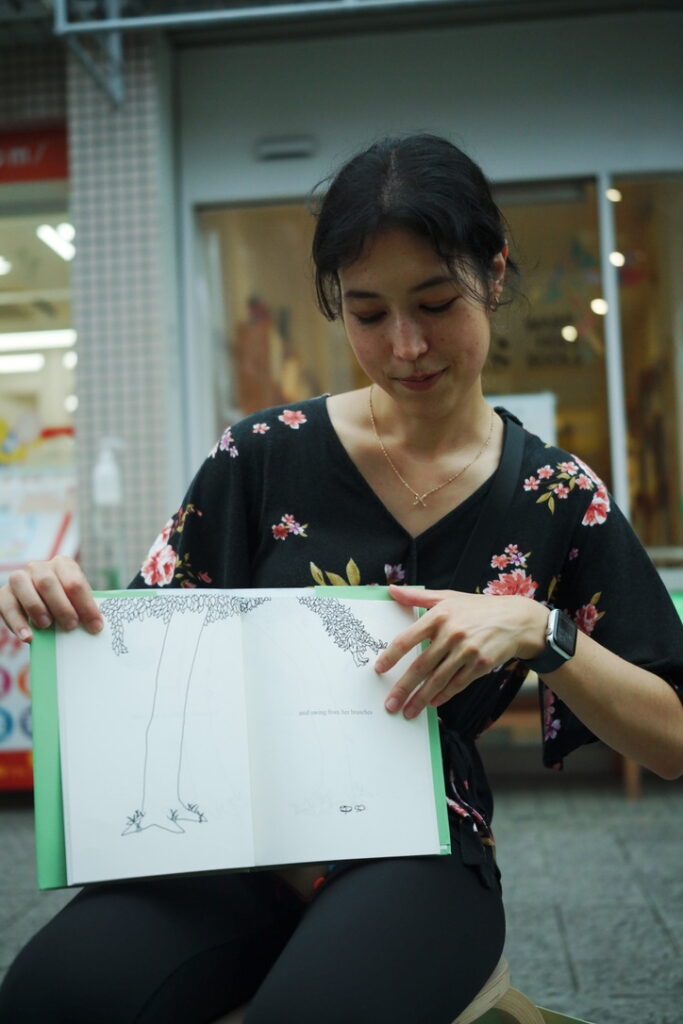 アメリカから東京都市大学にインターンにいらしていたアレックスさん。本が好きなアレックスさんがぜひWARP HOLE BOOKSでイベントをしたい!と考えてくださって、日本語と英語で『大きな木』を読み比べ、みんなで物語の別の結末を考える!FIX THE ENDINGというワークショップを歩行者天国で行いました。